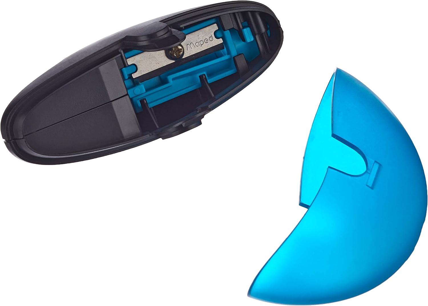 A stylish round sharpener available in yellow, pink, and blue. It features a secure container to collect pencil shavings, keeping desks clean. Compact, practical, and easy to carry in pencil cases.