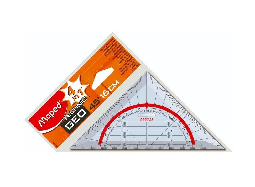 Maped Technic Geo Set Square 45° – 16 cm. A multifunctional 4-in-1 geometry tool combining a ruler, protractor, and precision markings for accurate measurements and drawing. Ideal for students and professionals.