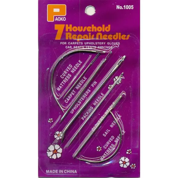 7-piece sewing needle set: Carpet 45mm, Glove 51mm, Sail 58mm, Flat Upholstery 89mm, Sack 75mm, Inclined Bed 49mm & 32mm. Ideal for sewing thick fabrics and household repairs.