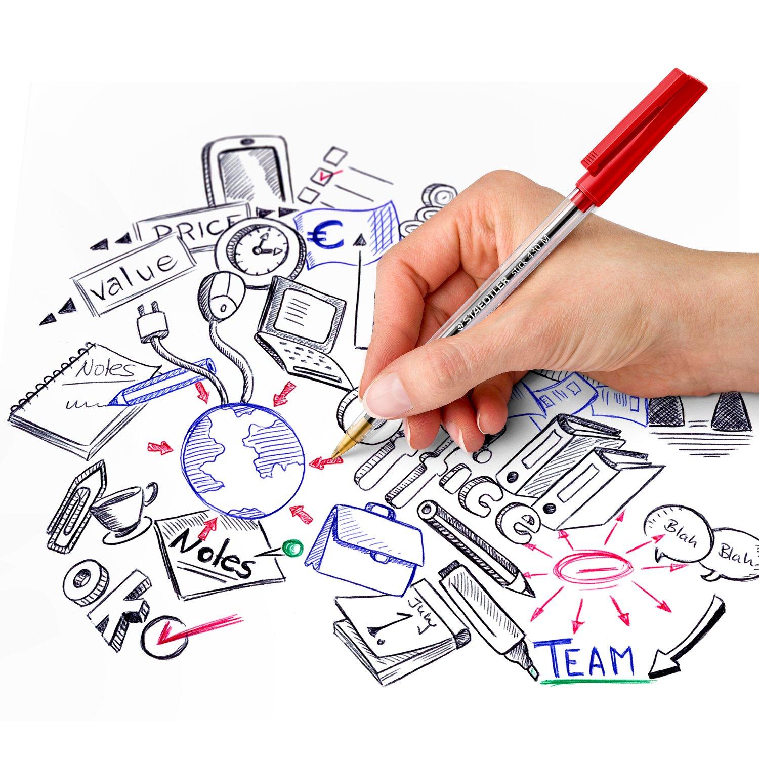 Staedtler Stick 430 Ballpoint Pen with medium line width for smooth writing. Available in blue, black, red, and green ink. Durable design, made in Germany.