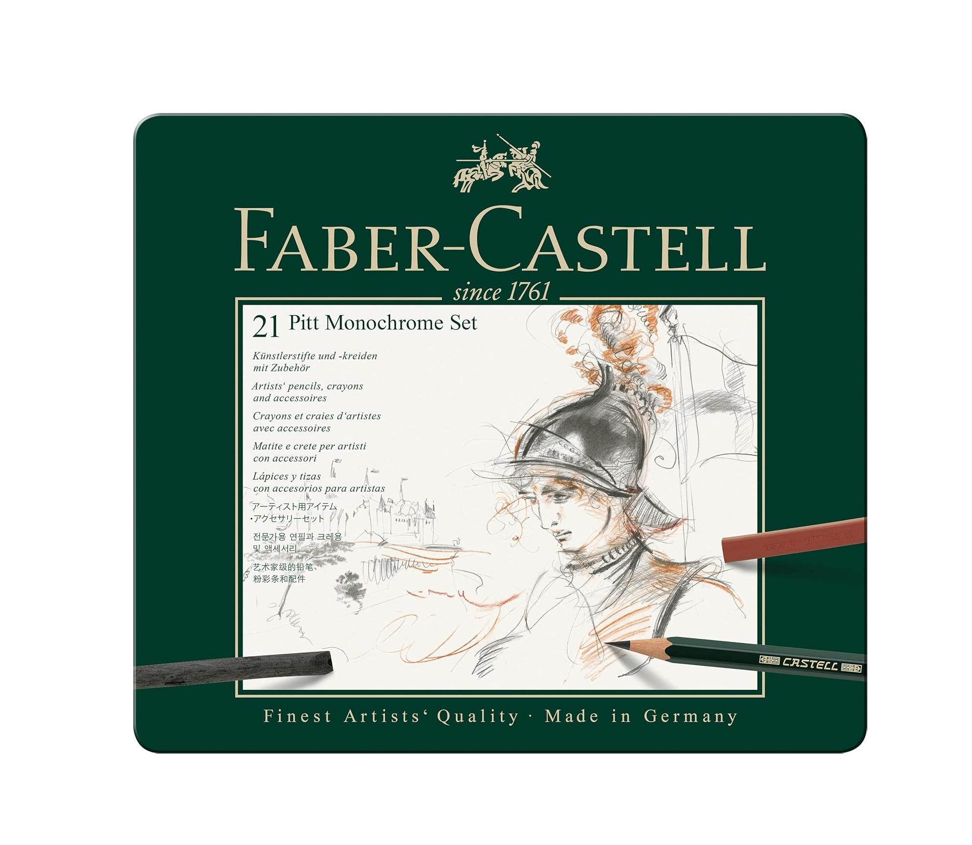 طقم فابر كاستل بيت مونوكروم يحتوي على 21 قلم فحم وجرافيت ناعم وعالي الجودة للرسم والتخطيط. يوفر الطقم مجموعة من الدرجات للأعمال الفنية الأحادية اللون والتظليل السلس.