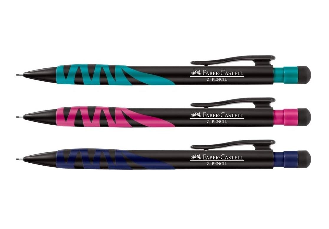 Faber-Castell Z Mechanical Pencil 0.5 mm offers a lightweight design with a comfortable grip for daily writing and drawing. It uses 0.5 mm leads and includes an eraser under the cap. Available in pink, aqua blue, and dark blue.