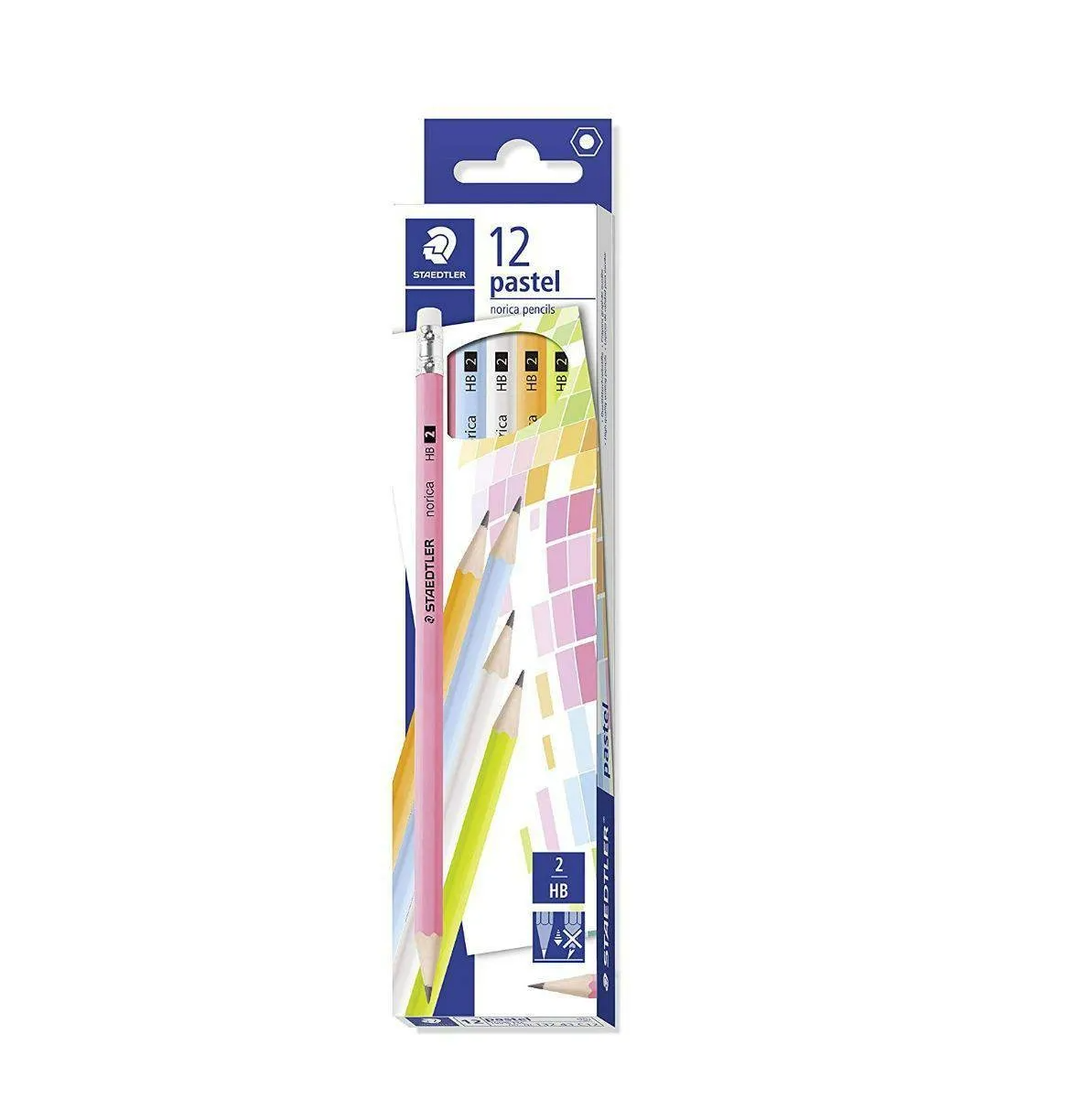 STAEDTLER Norica Pastel graphite pencils with eraser tip, grade HB (2), pack of 12 pieces. Comes in stylish pastel colors for a modern look. High-quality wood, break-resistant lead, and smooth writing performance. Ideal for school, office, and creative use.