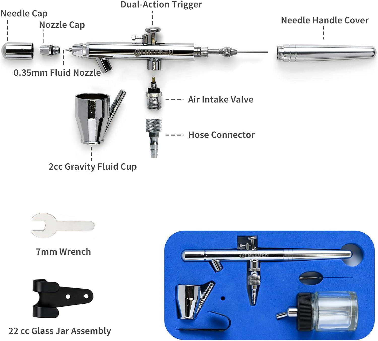 This professional MEEDEN airbrush spray gun kit offers versatility and performance for multiple creative applications. Each airbrush is factory pre equipped with a specific needle size to eliminate setup time and ensure reliable operation. The gravity feed and siphon feed options support smooth paint flow and minimal overspray. Built with durable materials the kit delivers long lasting performance and easy cleaning making it a dependable choice for artists nail technicians makeup professionals cake decorators and hobbyists.