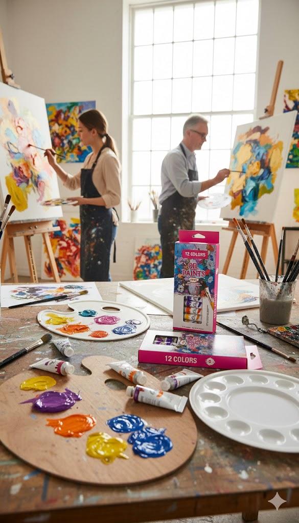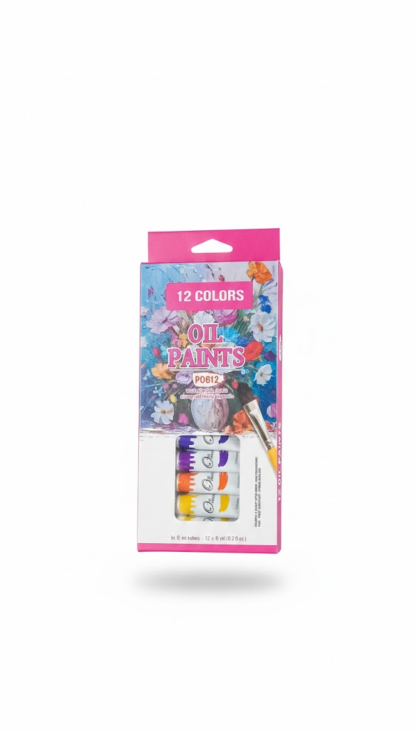 يحتوي الطقم على 12 لونًا زيتيًا في أنابيب، مناسب للرسم على القماش والخشب والأسطح المختلطة. ألوان غنية وسهلة الدمج ومثالية للمشاريع الإبداعية.