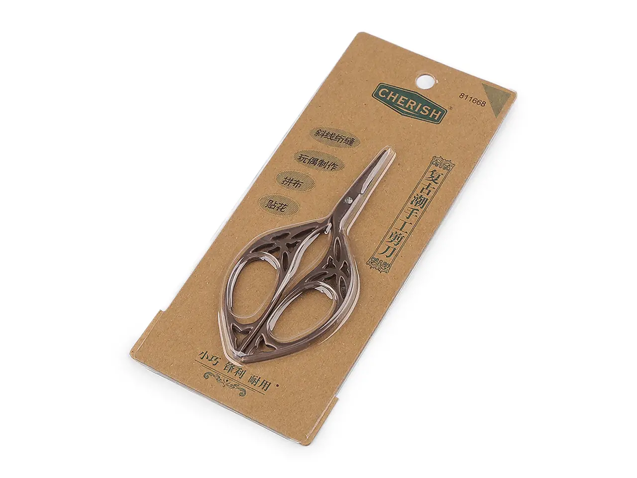 مقص تطريز زخرفي مصنوع بالكامل من المعدن ومصمم للقص الدقيق للخيوط والأقمشة والورق والتفاصيل الصغيرة في الأعمال اليدوية. حجمه الصغير يسمح بقص دقيق لمشاريع التطريز والخياطة والسكربوكينغ. شفرات حادة ومتينة تمنح قصًا نظيفًا وسلسًا. الطول الكلي 10.5 سم وطول الشفرة 2.2 سم.