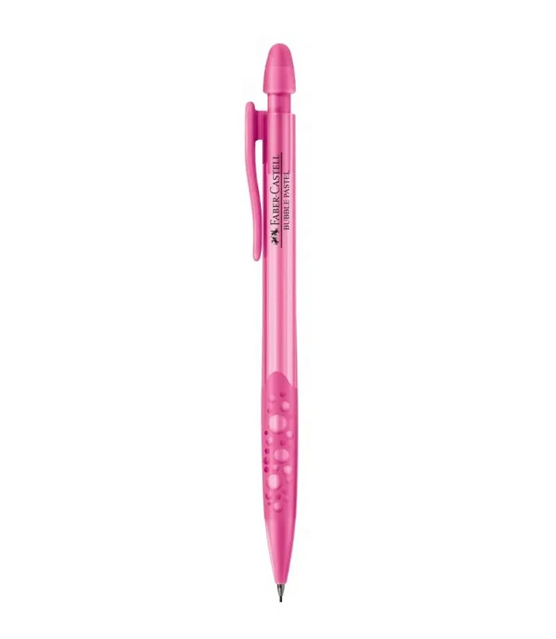 Faber-Castell Bubble Mechanical Pencil 0.5 mm features a fun design with a comfortable grip for everyday writing. It uses 0.5 mm leads and comes with an eraser under the cap. Available in pink, aqua blue, blue, and purple.