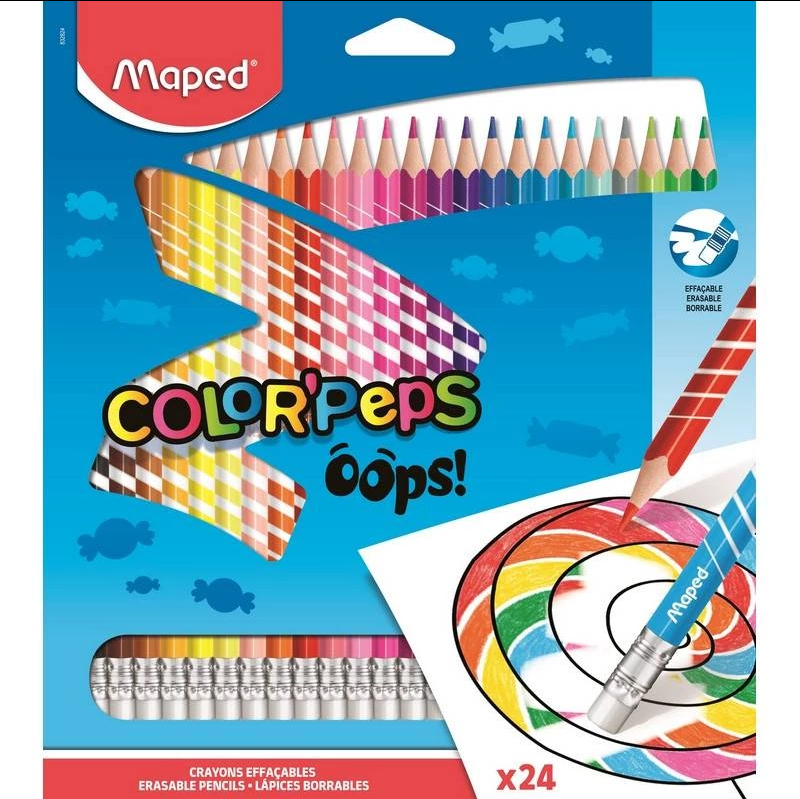 Maped Color’Peps Oops! Erasable Color Pencils – 24 colors. Bright and vivid coloring pencils designed with soft, resistant leads for smooth coloring. Each pencil comes with an eraser tip, allowing mistakes to be easily erased for a clean finish. Perfect for school, art, and creative projects.