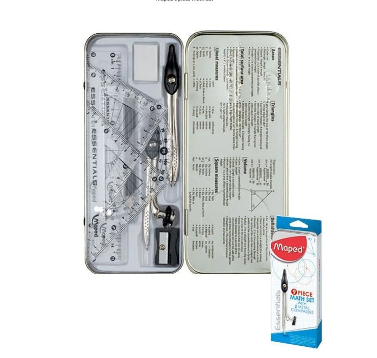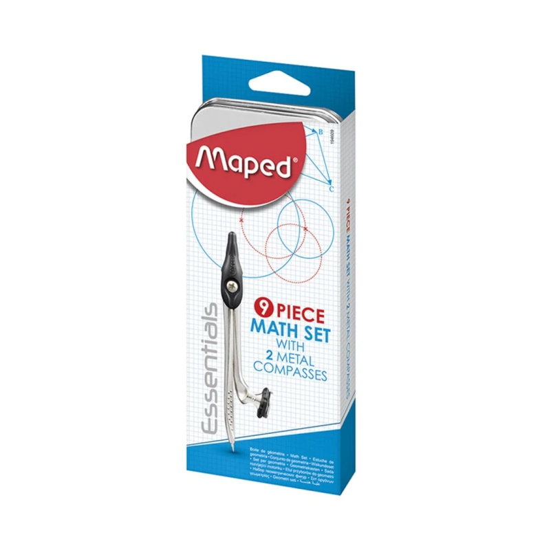 Maped Essentials 9-Piece Math Set – A complete geometry set that includes 2 metal compasses, ruler, protractor, set squares, pencil, eraser, and sharpener. Perfect for students for math and geometry classes.