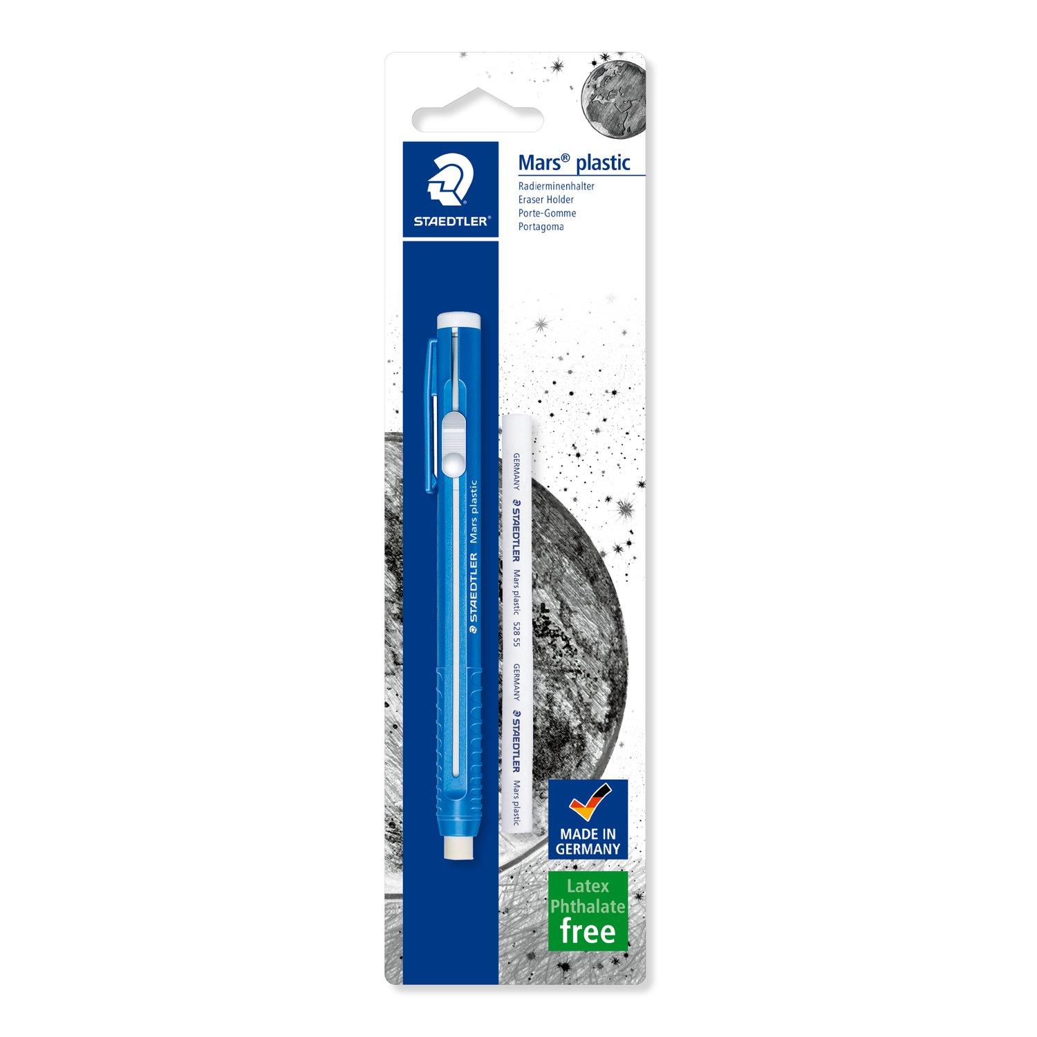 Staedtler Mars Plastic Eraser Holder with refill eraser. Provides precise and clean erasing. Latex- and phthalate-free for safe use. Refillable design for long-lasting use. Made in Germany.