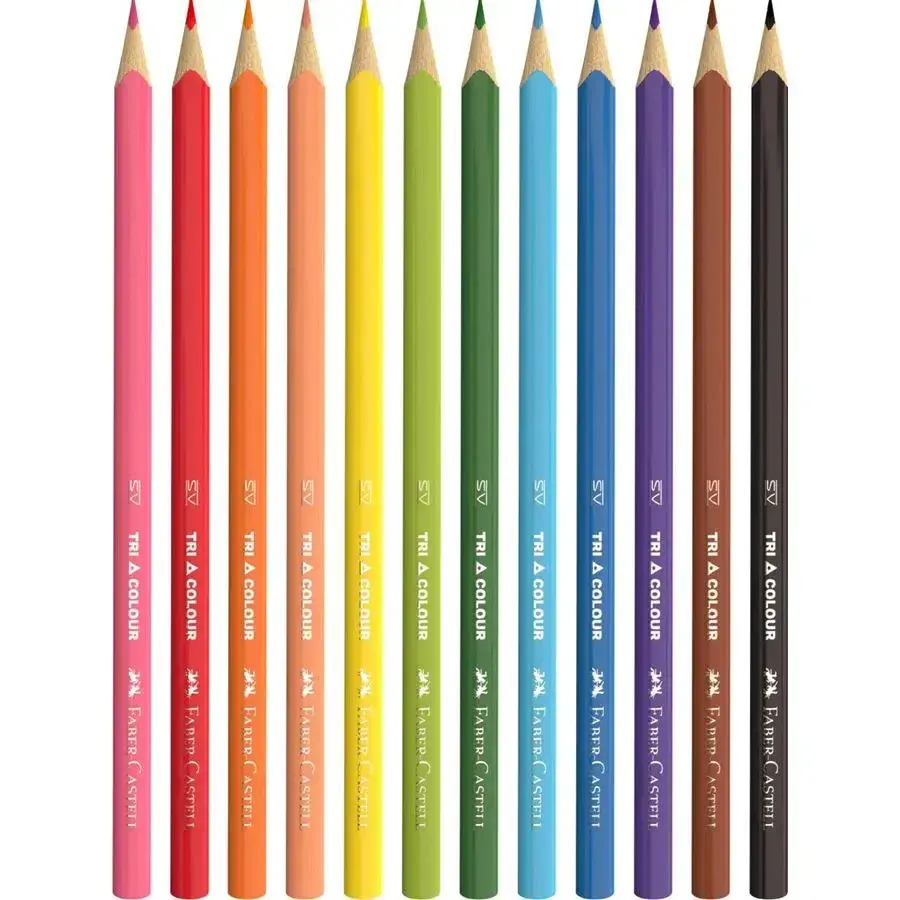 A set of 12 triangular-shaped colored pencils. The ergonomic design provides a comfortable grip, ideal for both children and adults. The pencils feature smooth, vibrant colors that are suitable for drawing and coloring.