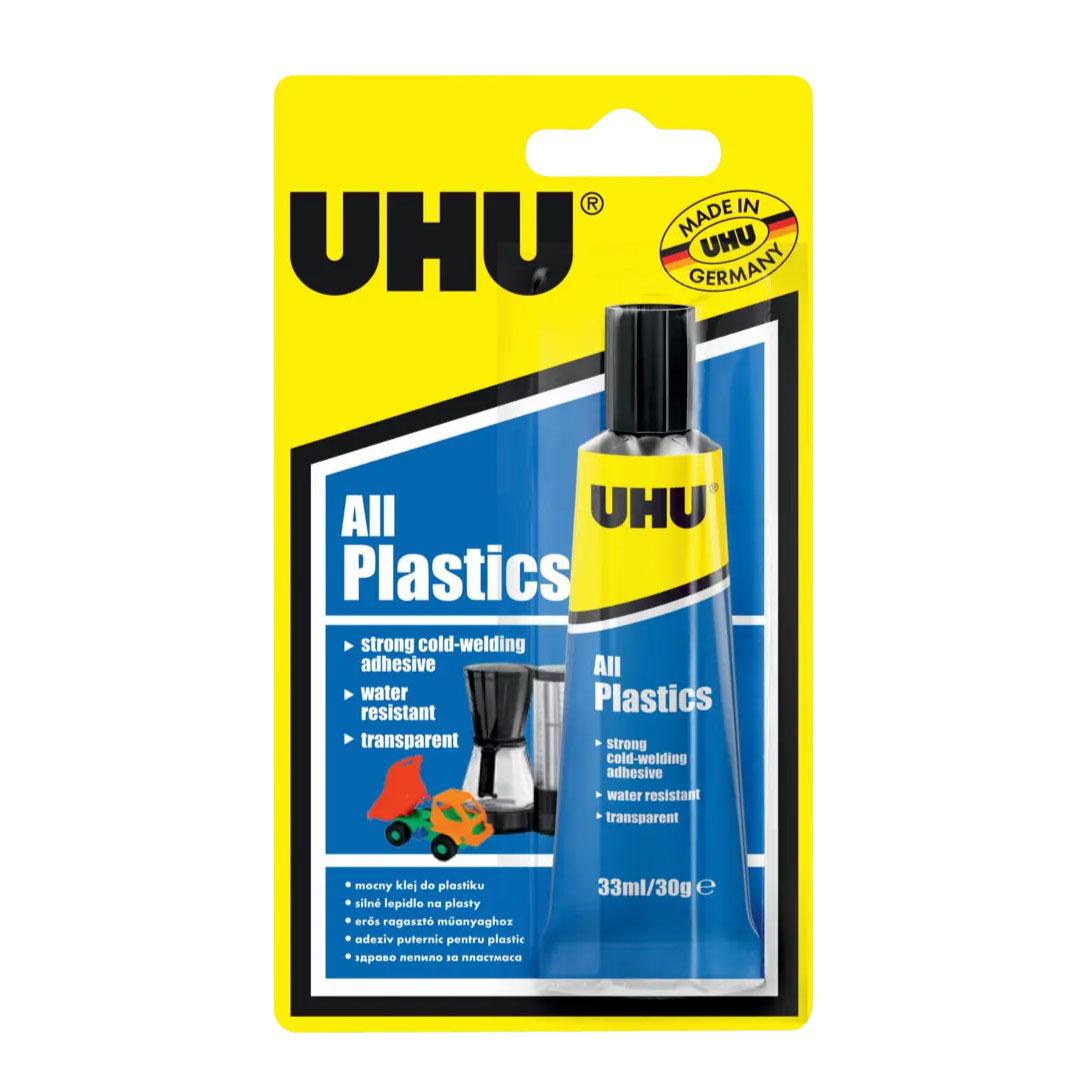 UHU All plastic is a transparent, strong universal adhesive for plastics. Ideal for household use, crafts, repairs, and model building. It forms a hard, clear film that is resistant to temperature.